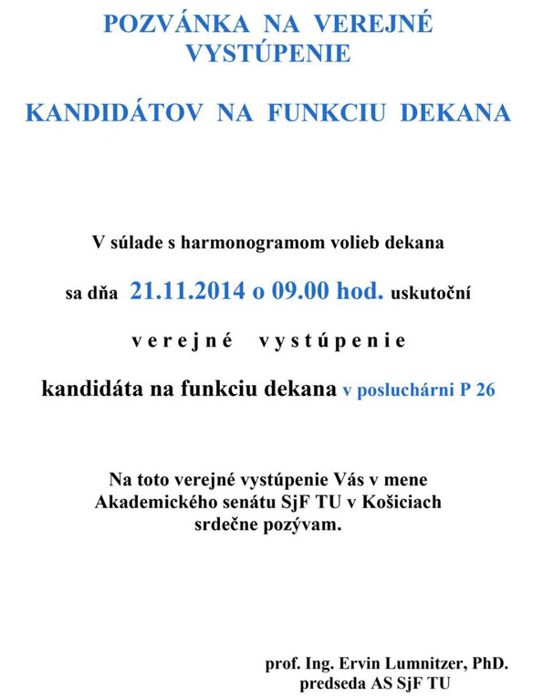 Pozvánka na verejné vystúpenie kandidátov na dekana SjF